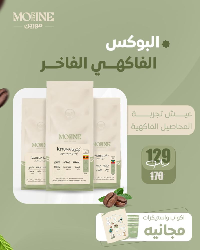 البوكس الفاكهي الفاخر بحمصة شاملة (مناسبة لمشروبات الفلتر والاسبريسو) يحتوي على 3 محاصيل من المحاصيل الفاخرة والمختلفة بالاضافة الى الاكواب والاستيكرات .