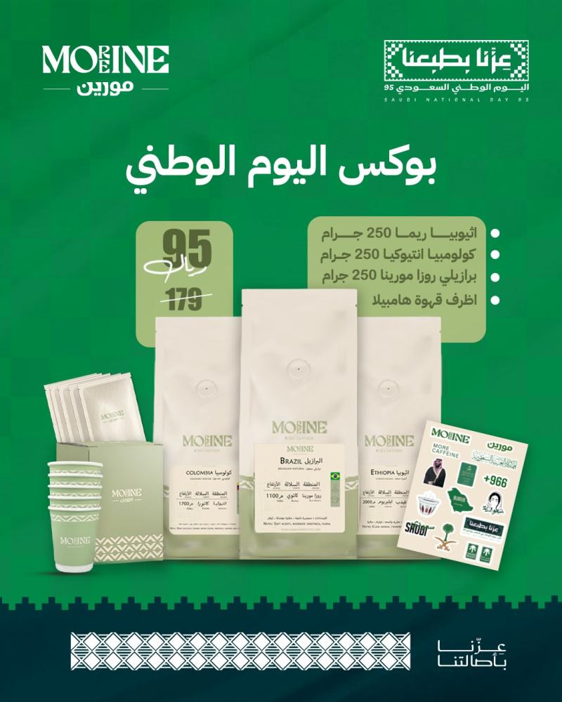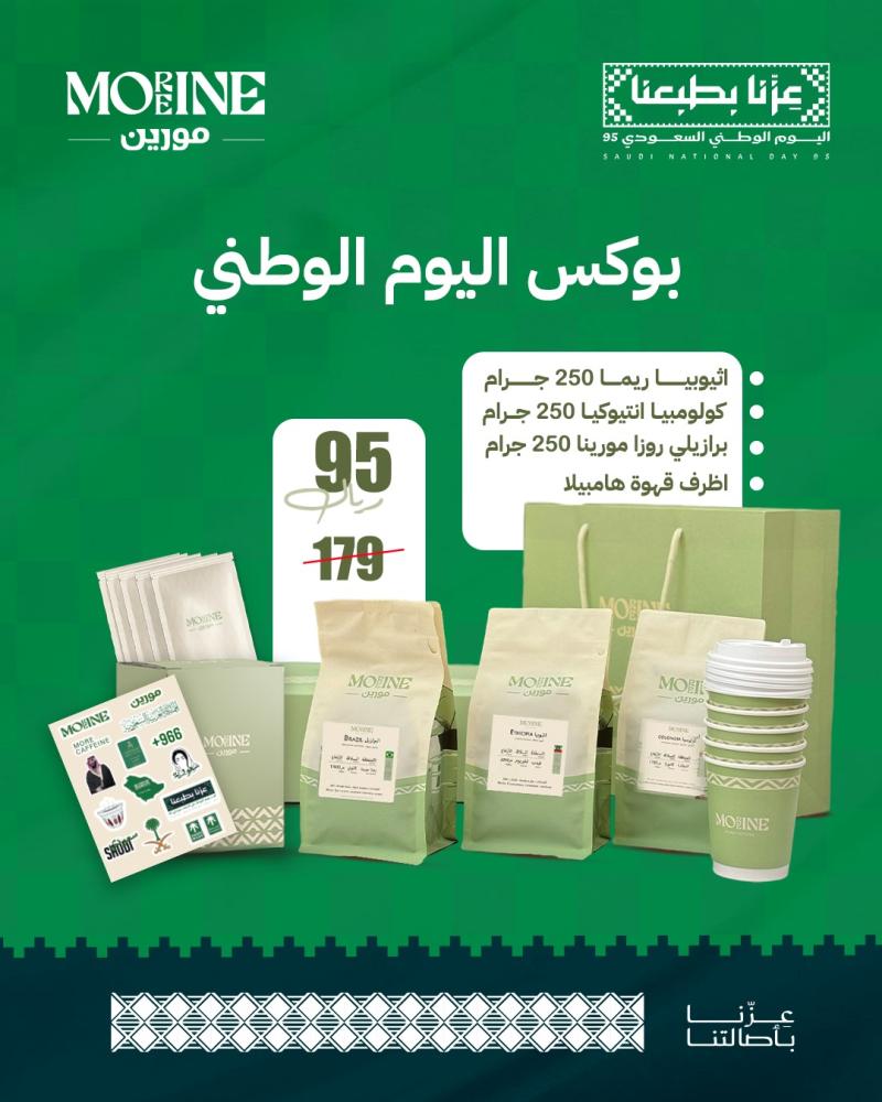 البوكس اليوم الوطني بحمصة شاملة (مناسبة لمشروبات الفلتر والاسبريسو) يحتوي على 4 محاصيل من المحاصيل الفاخرة والمختلفة بالاضافة الى الاكواب والاستيكرات .